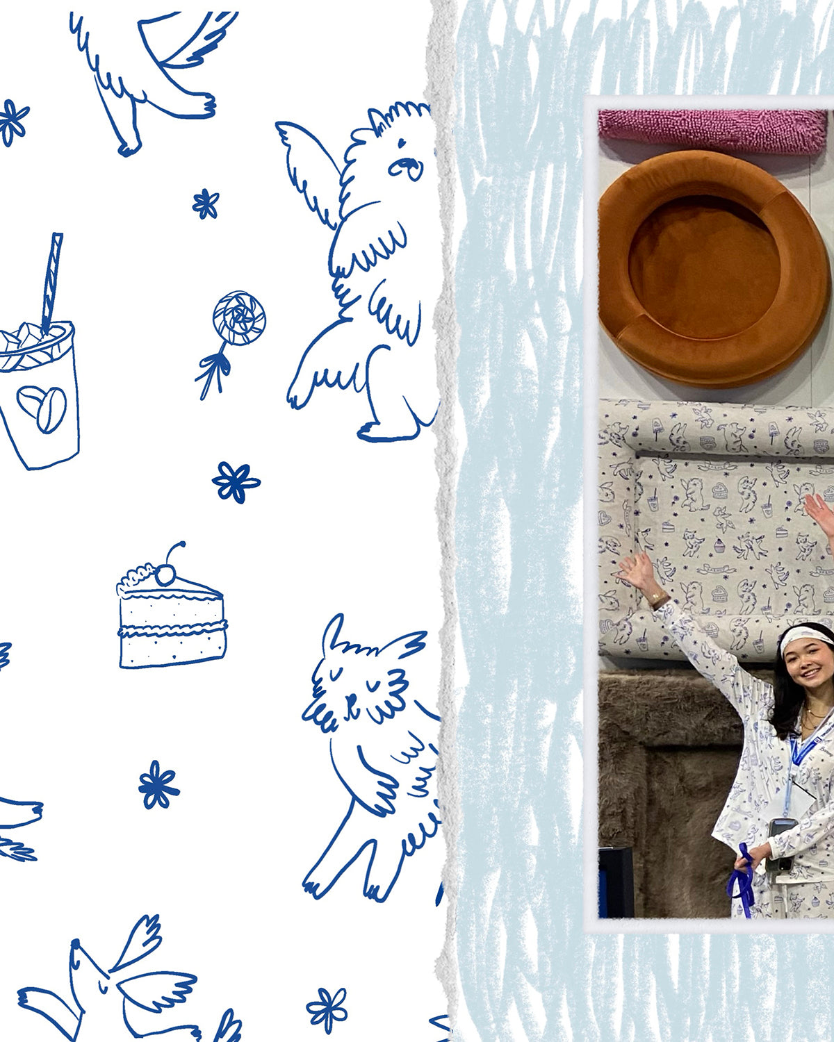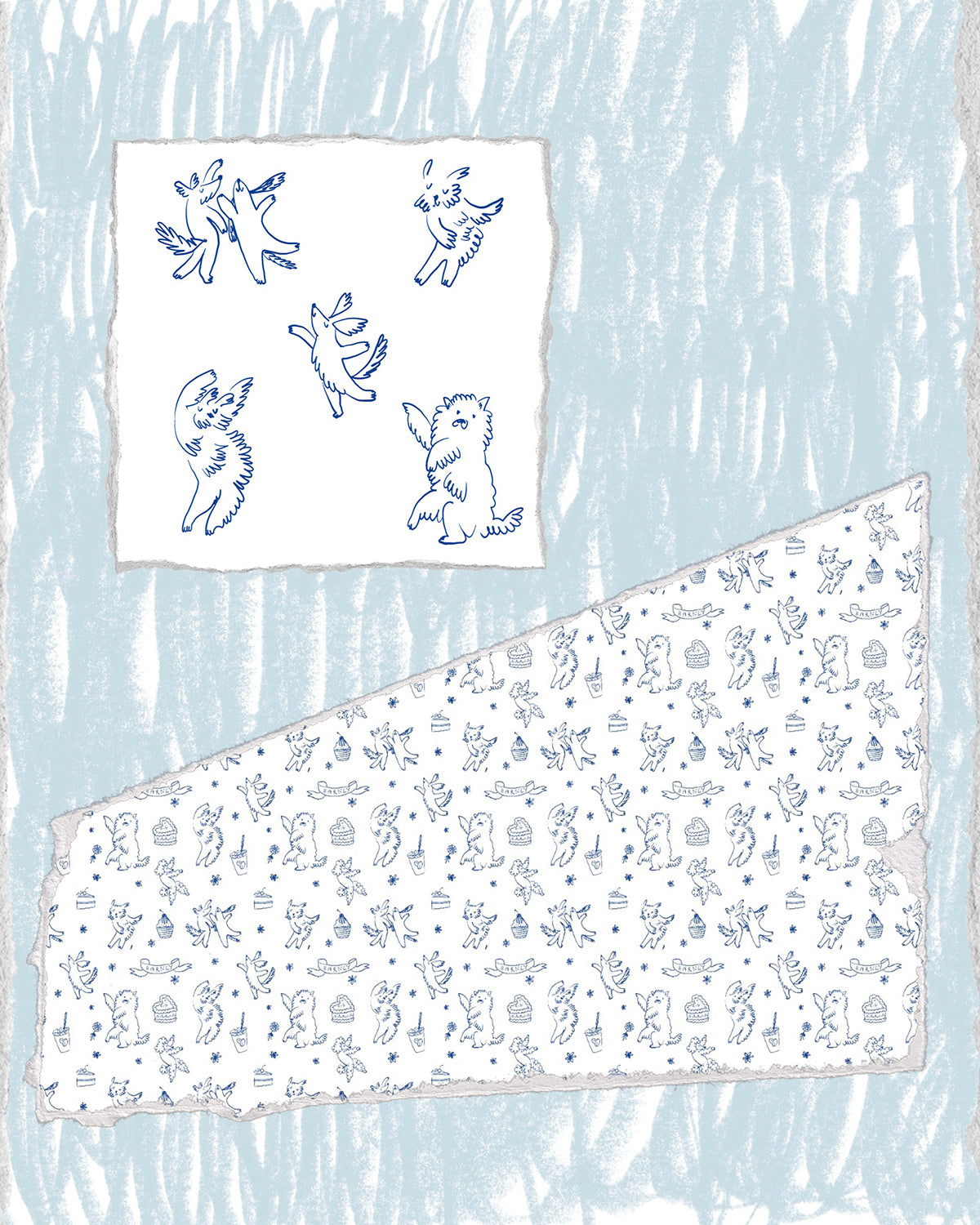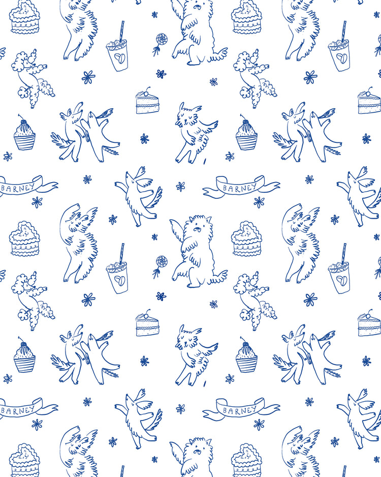 I started with loose sketches, developed them into a set of dancing-dog icons, and built them into a repeat pattern. After reviewing color options, we chose a clean blue-and-white palette. Once finalised, the pattern moved into production - an exciting moment seeing the artwork come to life.