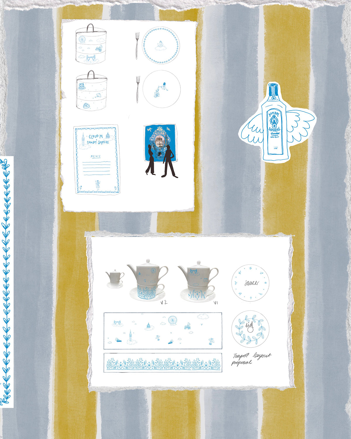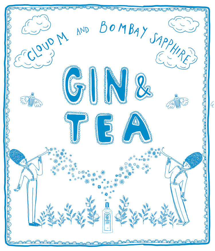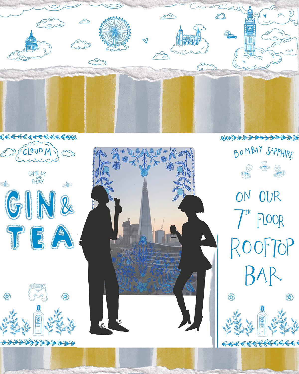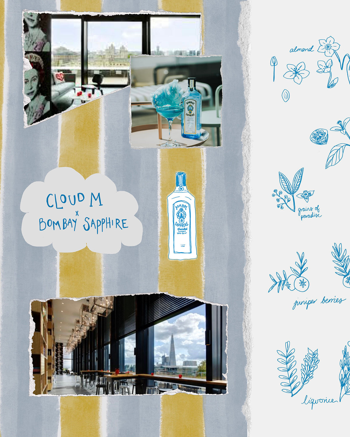 Set above the city with sweeping views, the CloudM Bar already feels suspended in the sky. We built on that atmosphere by drawing inspiration from clouds, the London skyline, and the botanicals used in Bombay Sapphire gin. A light blue, airy palette and playful illustrated elements created a whimsical, sky-like world for guests to step into.