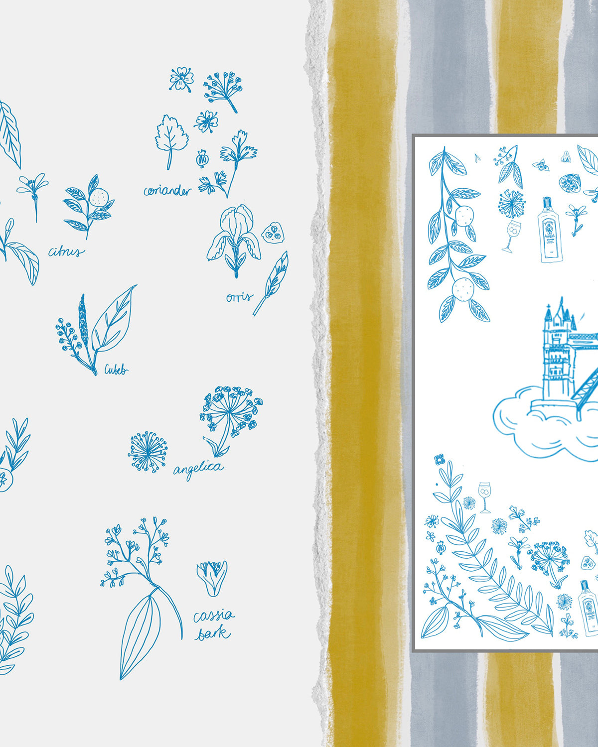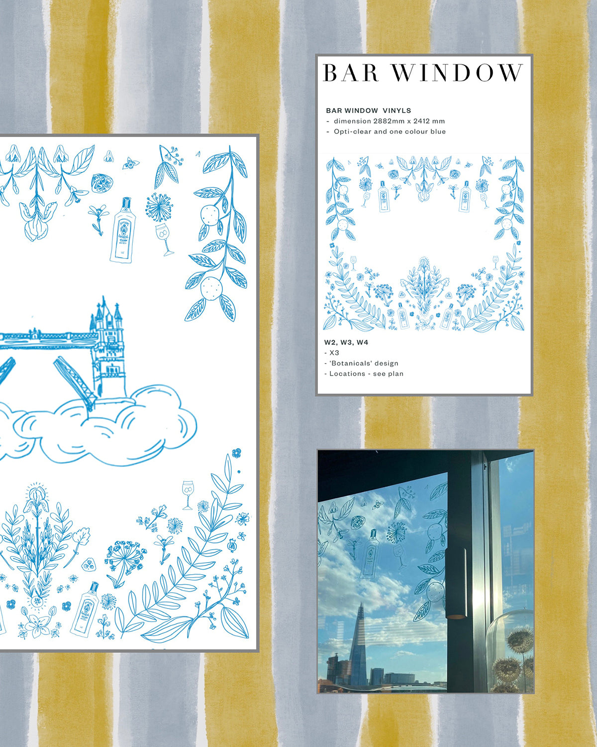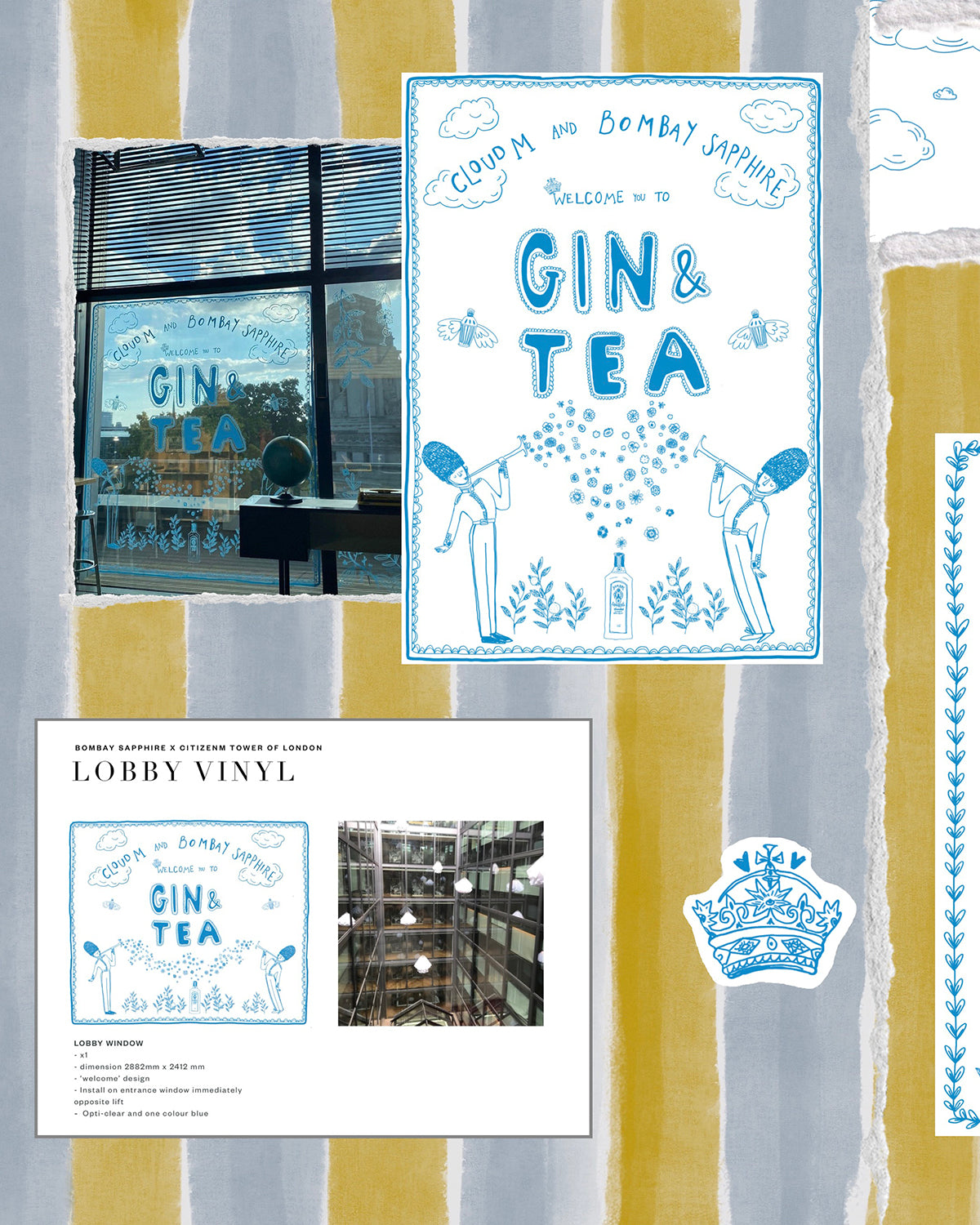 Set above the city with sweeping views, the CloudM Bar already feels suspended in the sky. We built on that atmosphere by drawing inspiration from clouds, the London skyline, and the botanicals used in Bombay Sapphire gin. A light blue, airy palette and playful illustrated elements created a whimsical, sky-like world for guests to step into.