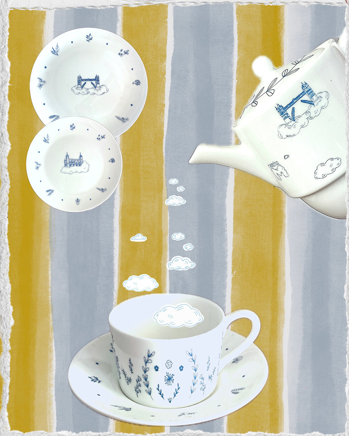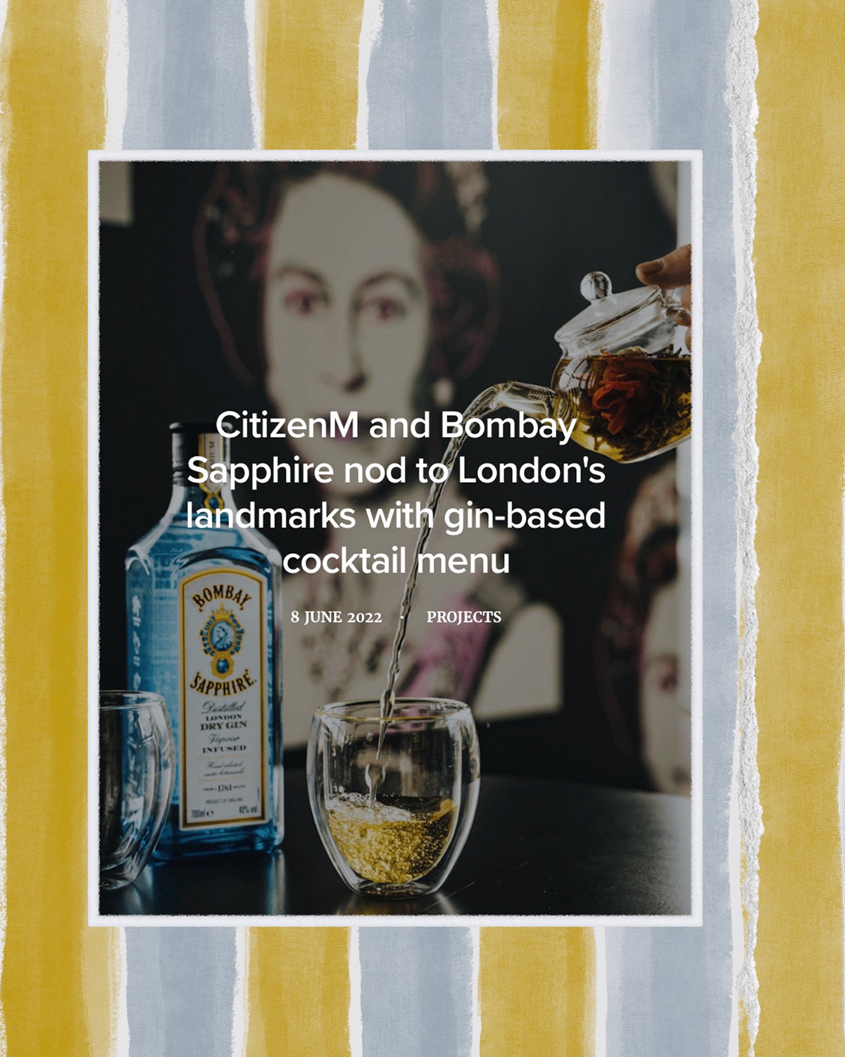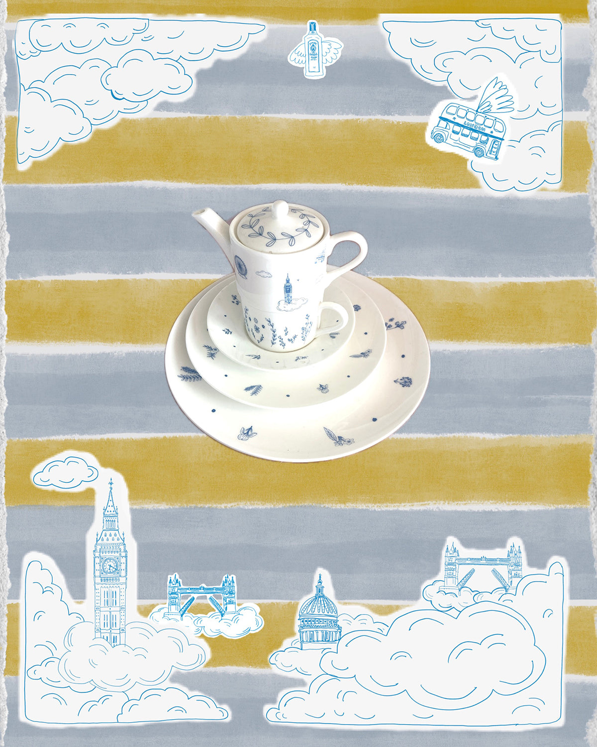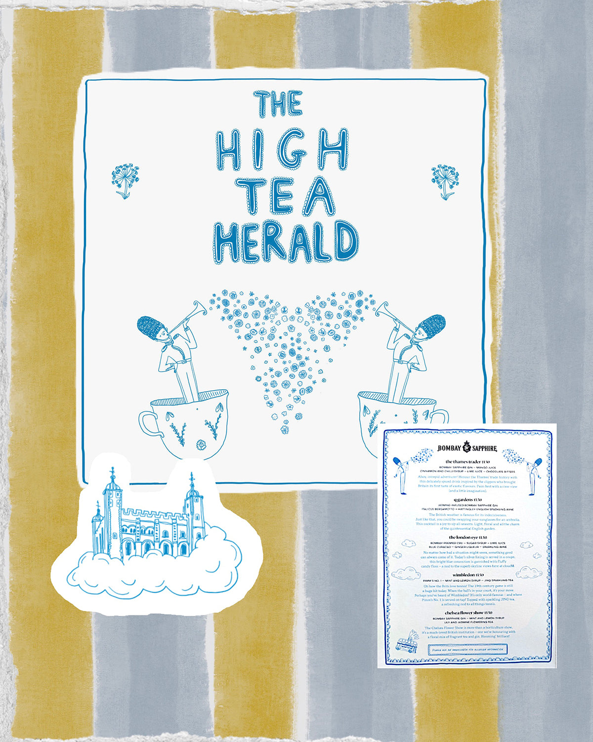 The takeover featured custom ceramics—including teapots, teacups, dinner and dessert plates—a fictional newspaper, menus, large-scale window vinyls that complemented the skyline, and a selfie mirror. I also created an engraved illustration for oversized cocktail glasses, subtly reimagining the Bombay Sapphire crest. The installation was launched in summer 2022 and was very well received.