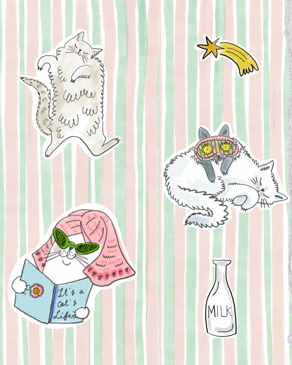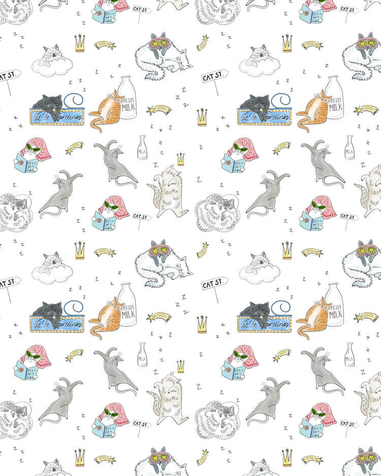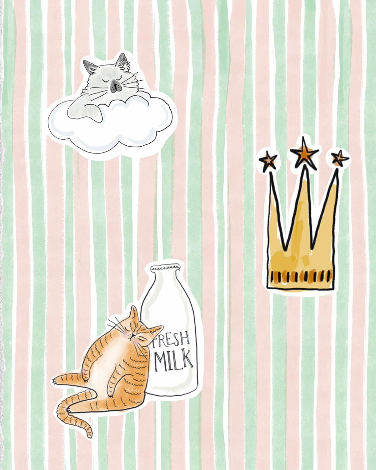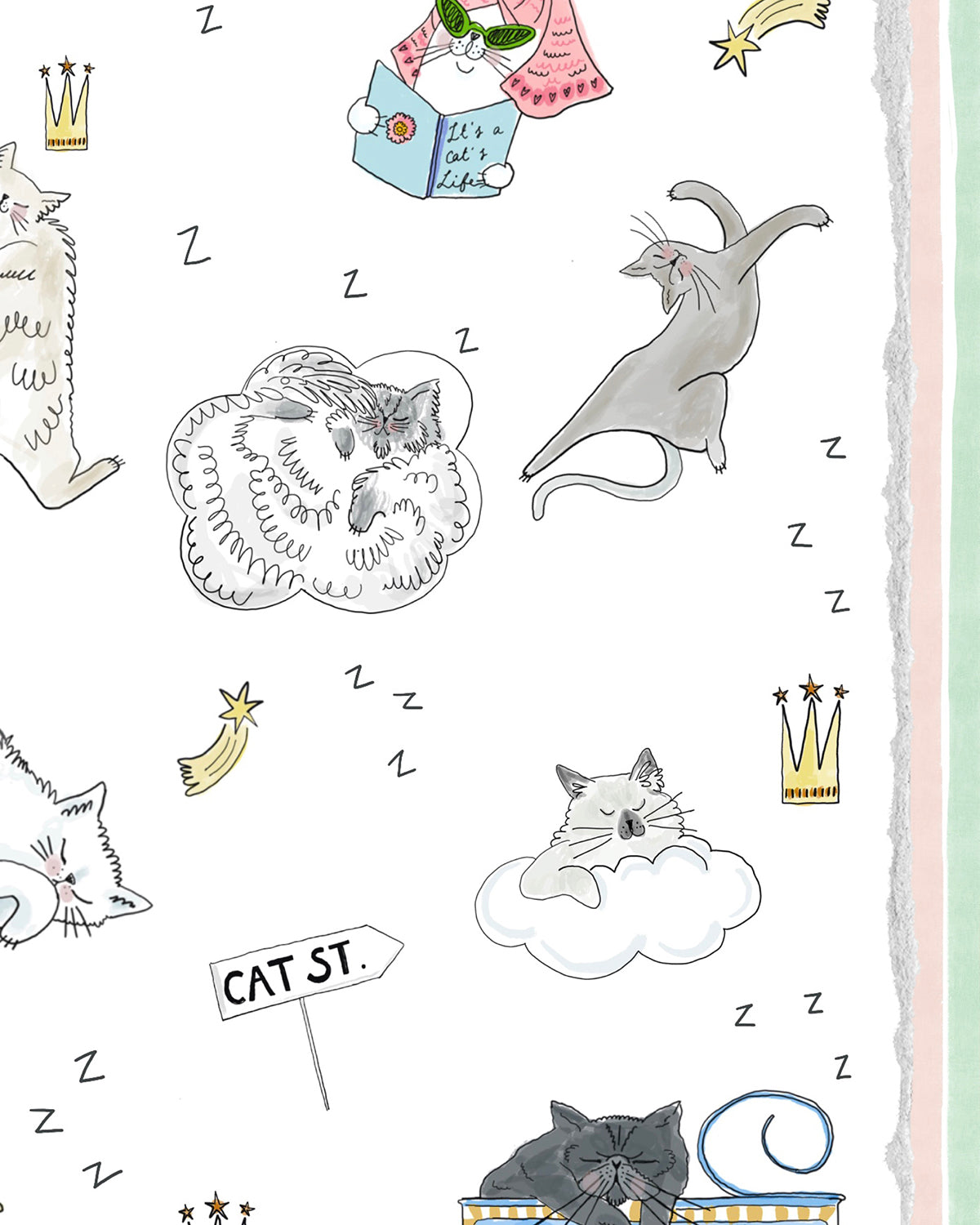 We imagined cats completely immersed in relaxation: lounging at a spa, dozing off after drinking lots of milk, and enjoying life as the true kings of the house, complete with crowns. To reflect the cloud-like comfort of the beds, we incorporated soft, dreamy elements like clouds alongside playful cat-food motifs and cats interacting with one another.
