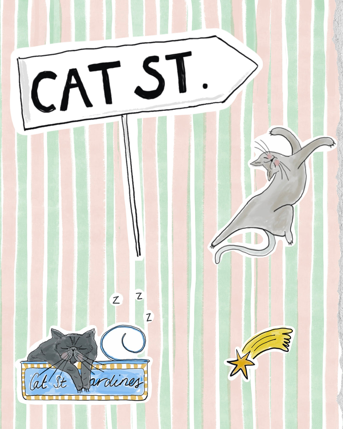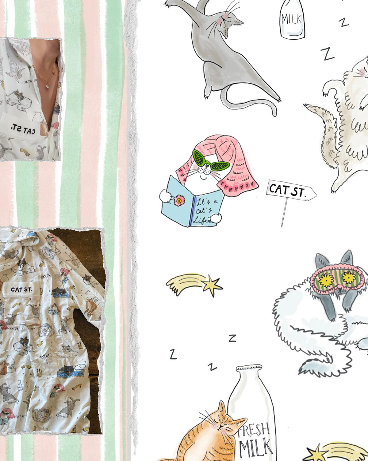 The design became part of a full 360° visual identity for their trade show, appearing on pajamas and soon-to-be-released textiles for the Cat St. bed. It received a special mention at the show, and elements from the artwork were also used on free merch for visitors.
